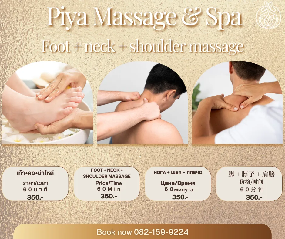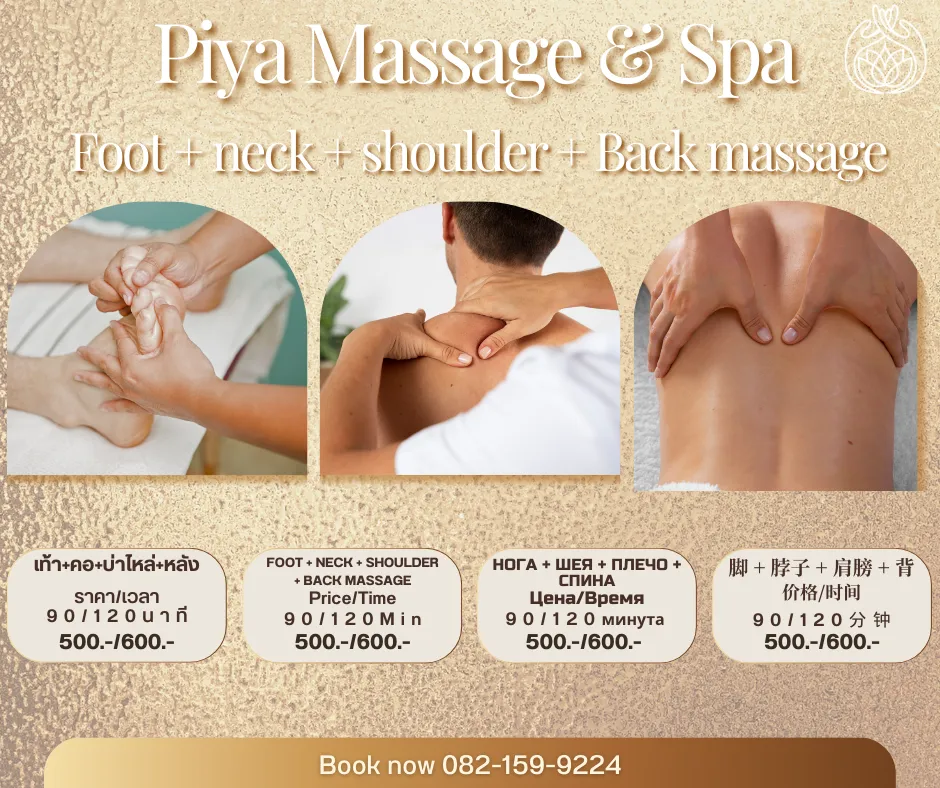 当Piya Thai Massage的大门敞开,我们的水疗套餐将重新定义芭提雅的健康与美丽。现在,尽情享受我们所有的按摩和水疗护理的特别优惠,与我们一起探索最真实的自己。
